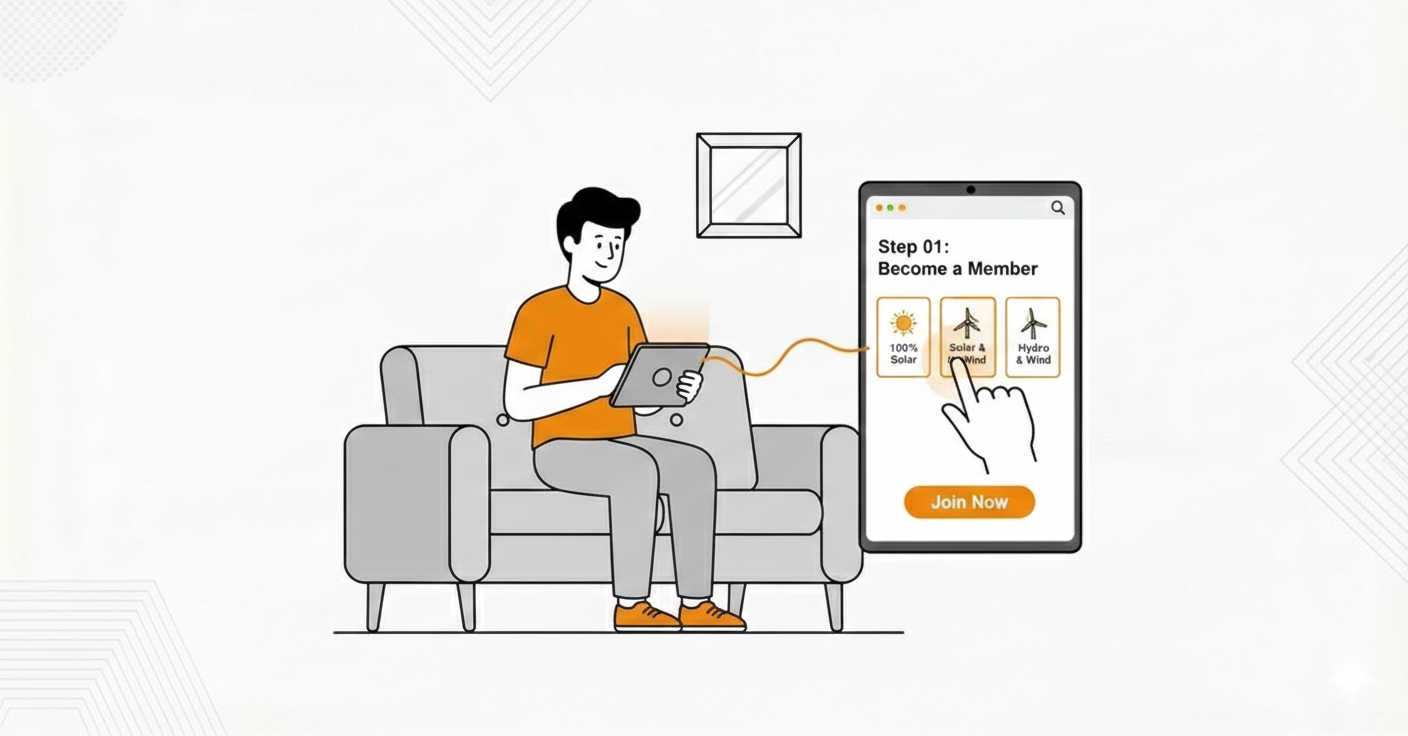 Choose the membership that matches your goals: 100% Solar, a Solar & Wind mix, or a Wind & Hydro blend. It takes 60 seconds. No installations, no utility switch, no contracts. Just a simple monthly membership that puts your dollars to work for clean energy.