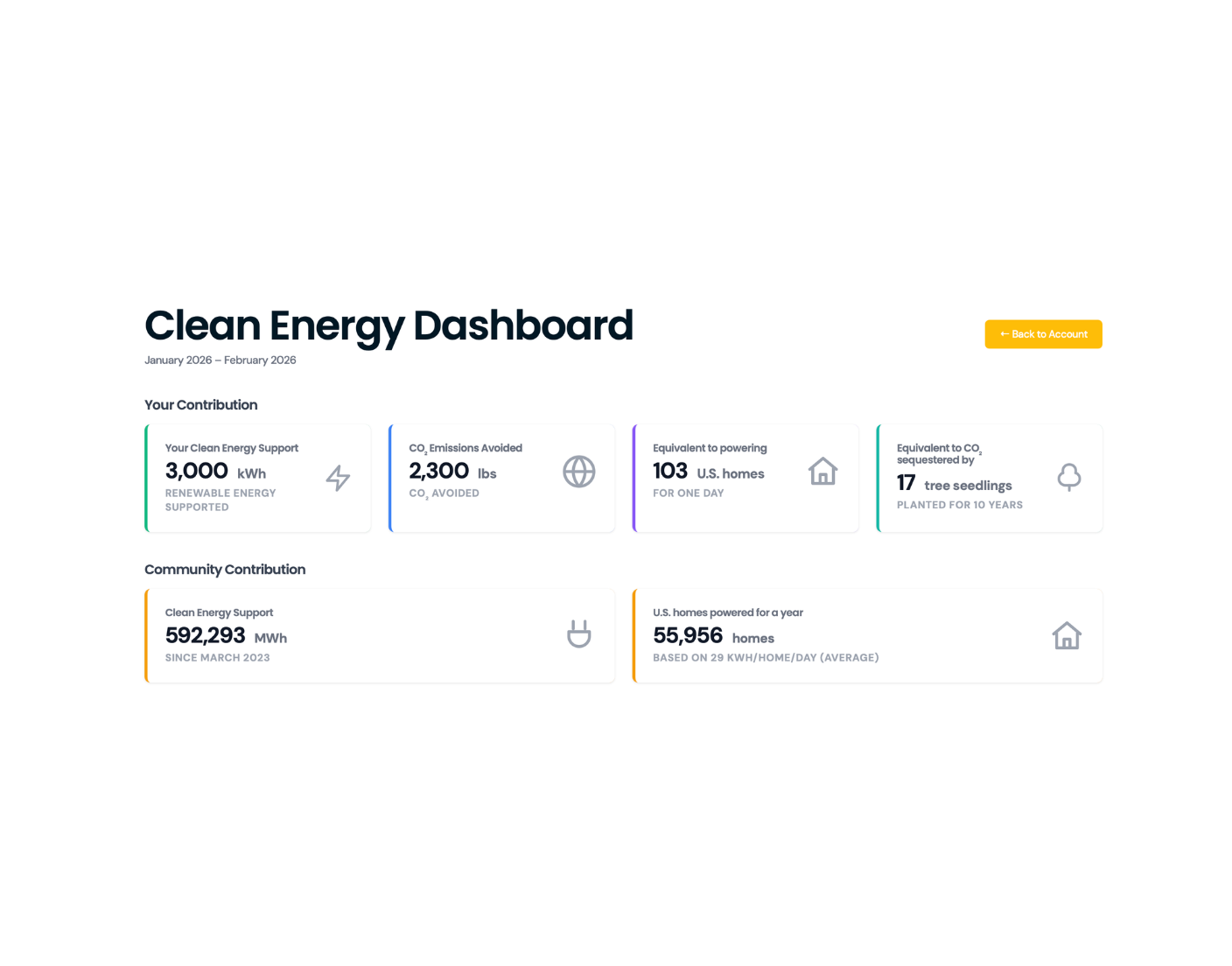 Your personalized Clean Energy Dashboard updates every month with the real numbers — kilowatt-hours supported, pounds of CO₂e avoided, and how your contribution compares to real-world equivalents like homes powered or trees planted. Your impact is calculated from actual retirements.