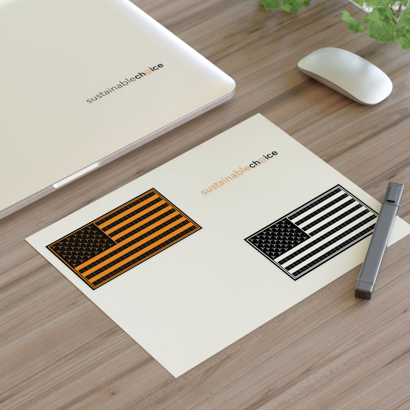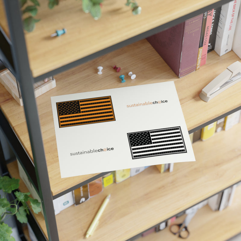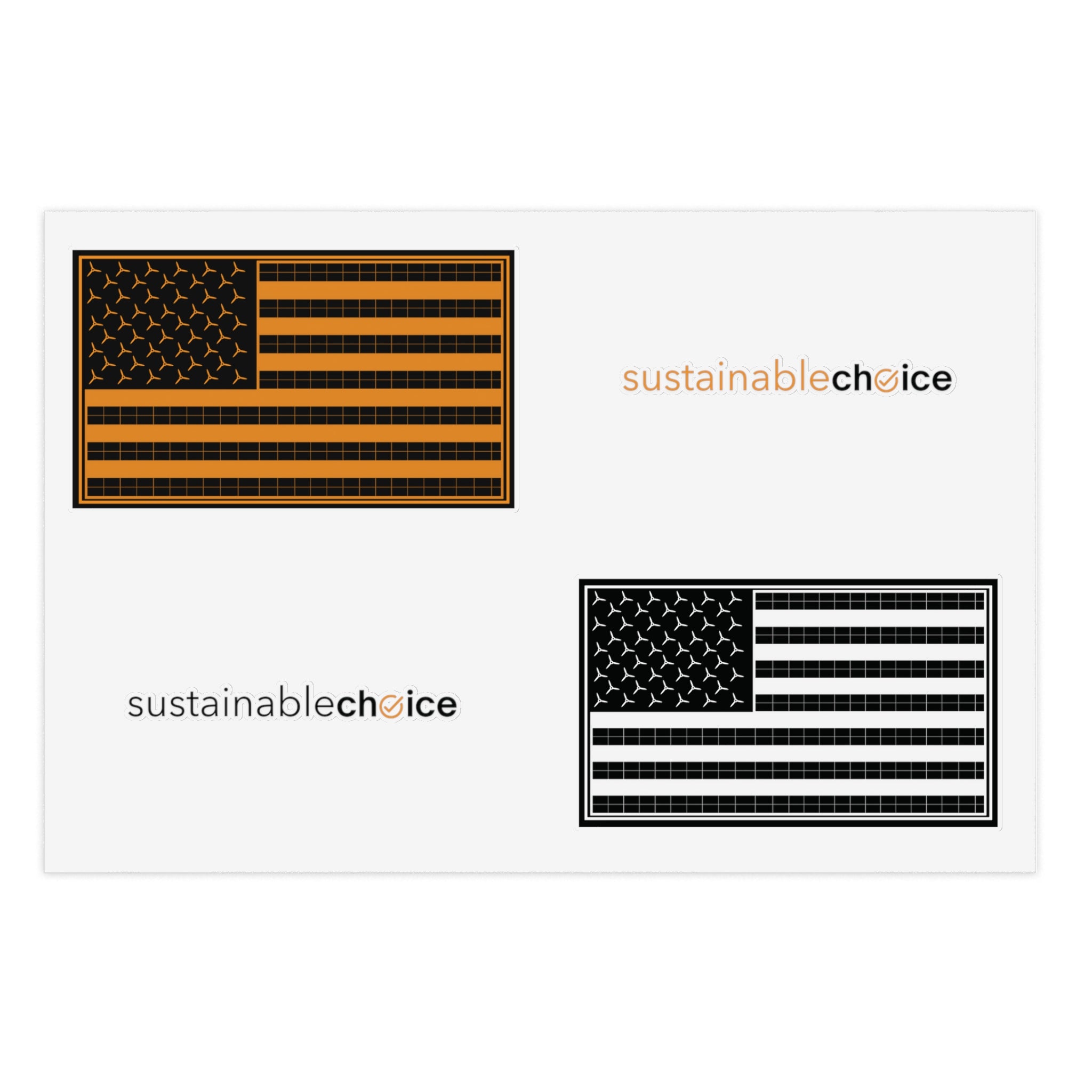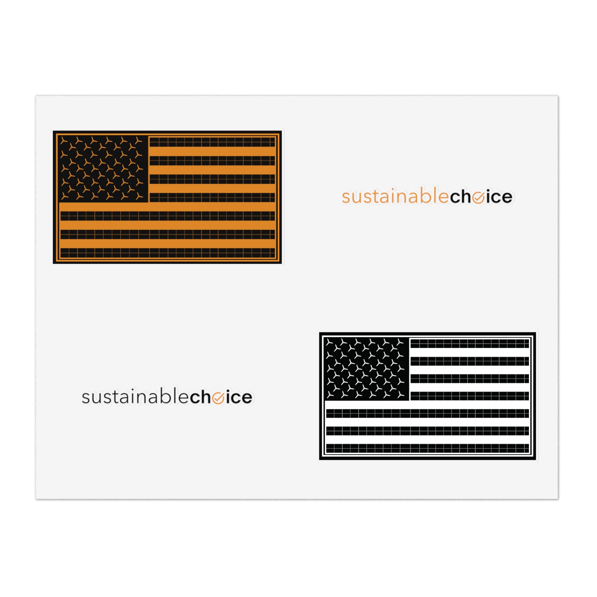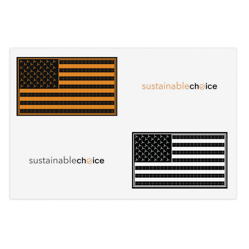 Show your support for a cleaner energy future with this 4-piece sticker sheet featuring two Sustainable Choice logos and two U.S. Renewable Energy Flags. Perfect for laptops, water bottles, notebooks, bike helmets...anywhere you want to inspire action.
