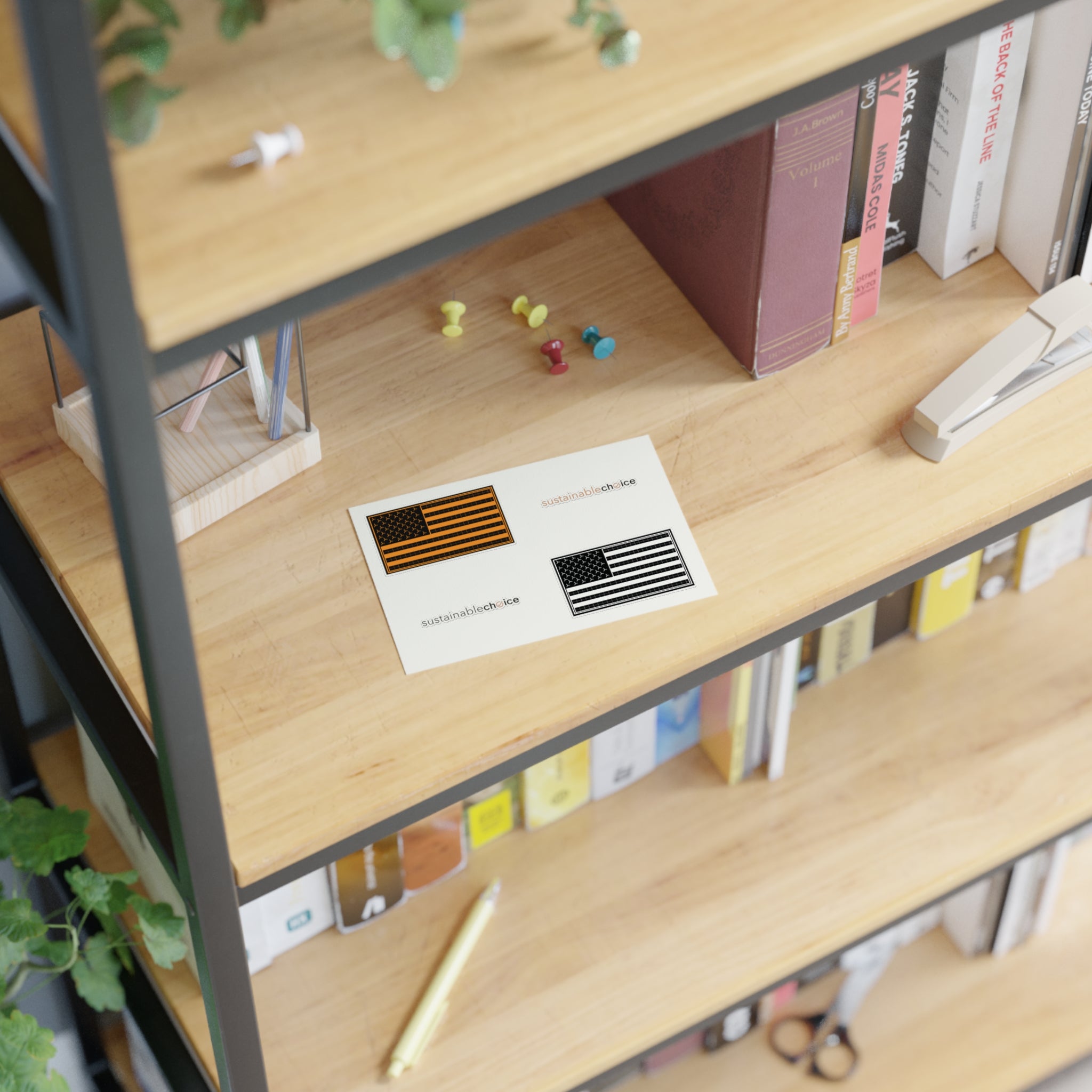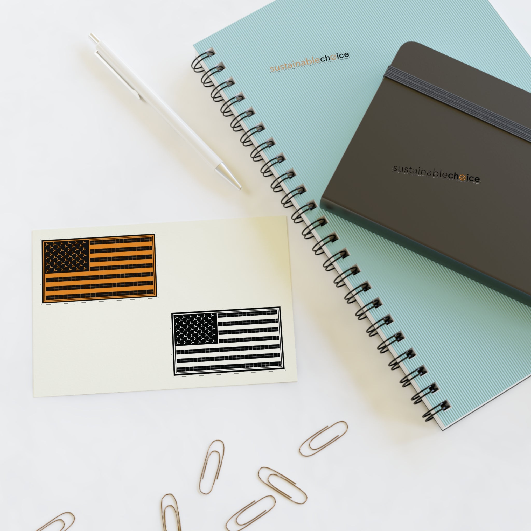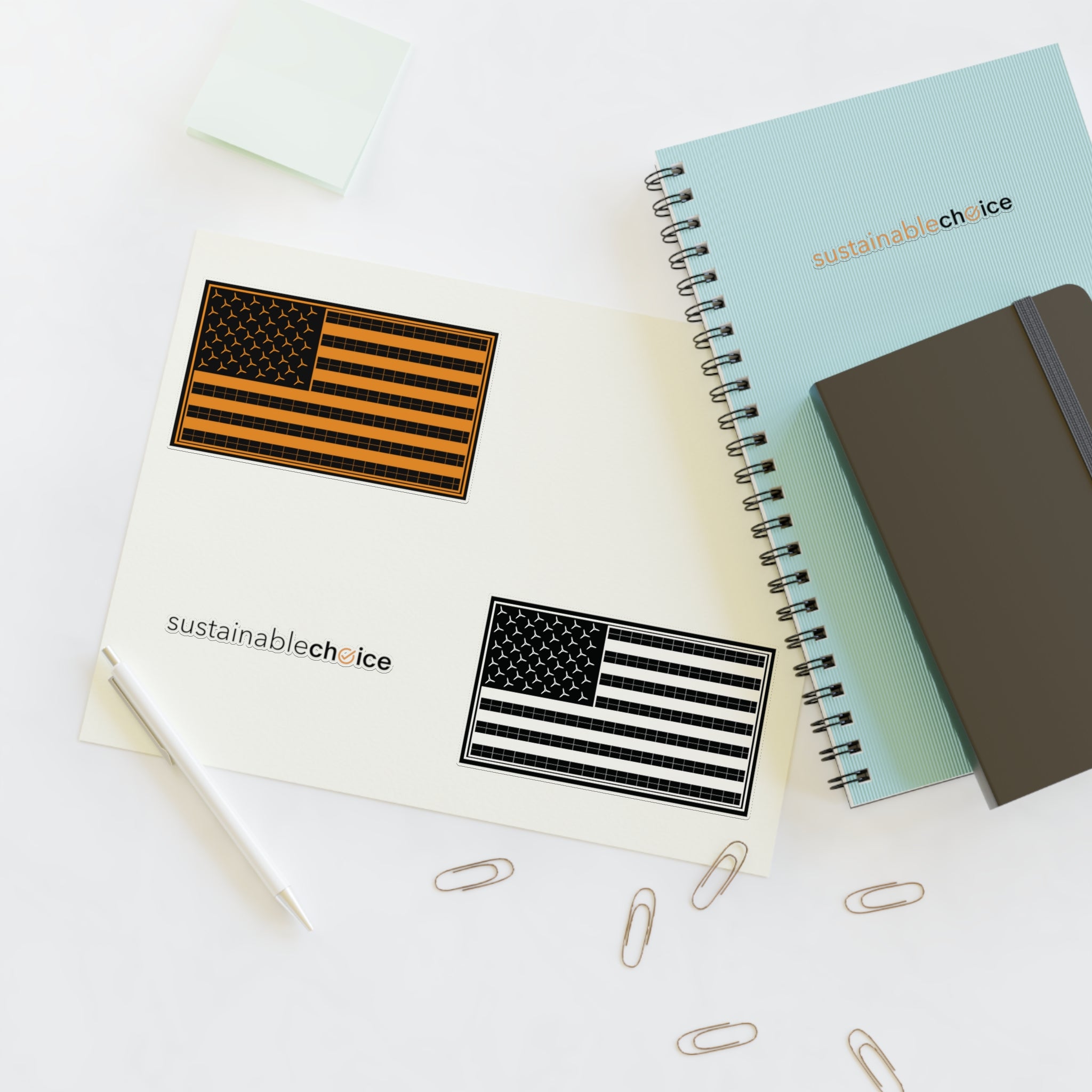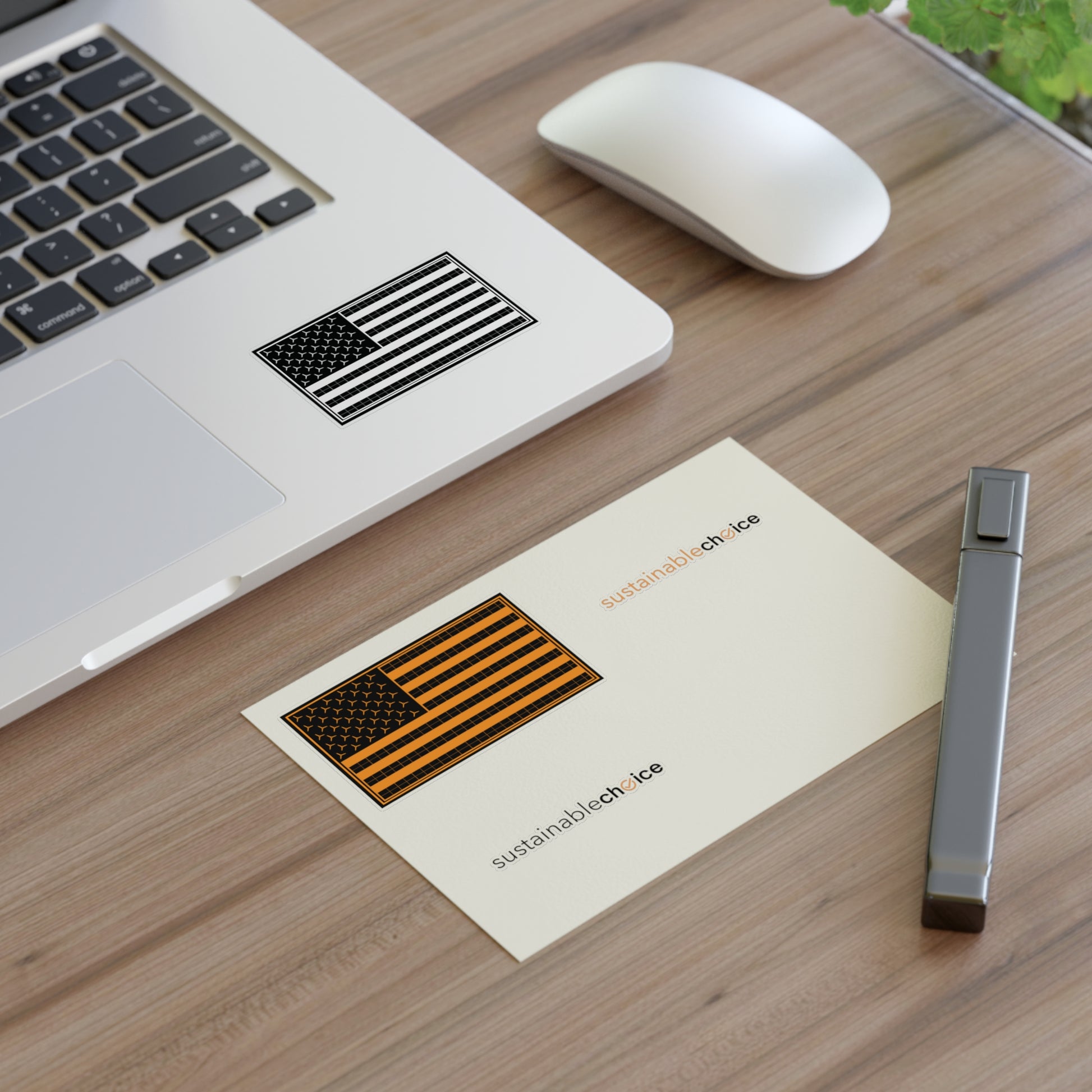 Show your support for a cleaner energy future with this 4-piece sticker sheet featuring two Sustainable Choice logos and two U.S. Renewable Energy Flags. Perfect for laptops, water bottles, notebooks, bike helmets...anywhere you want to inspire action.
